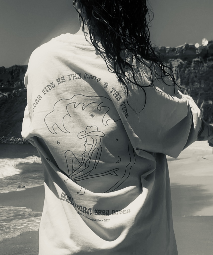 The Easy Rider in Light Bone is a heavyweight, oversized long sleeve tee made for dawn patrols, beach bonfires, and slow days under the sun. Featuring a bold back graphic that captures the soul of the surf and our signature SB stamp. A piece built to feel lived-in from the first wear.